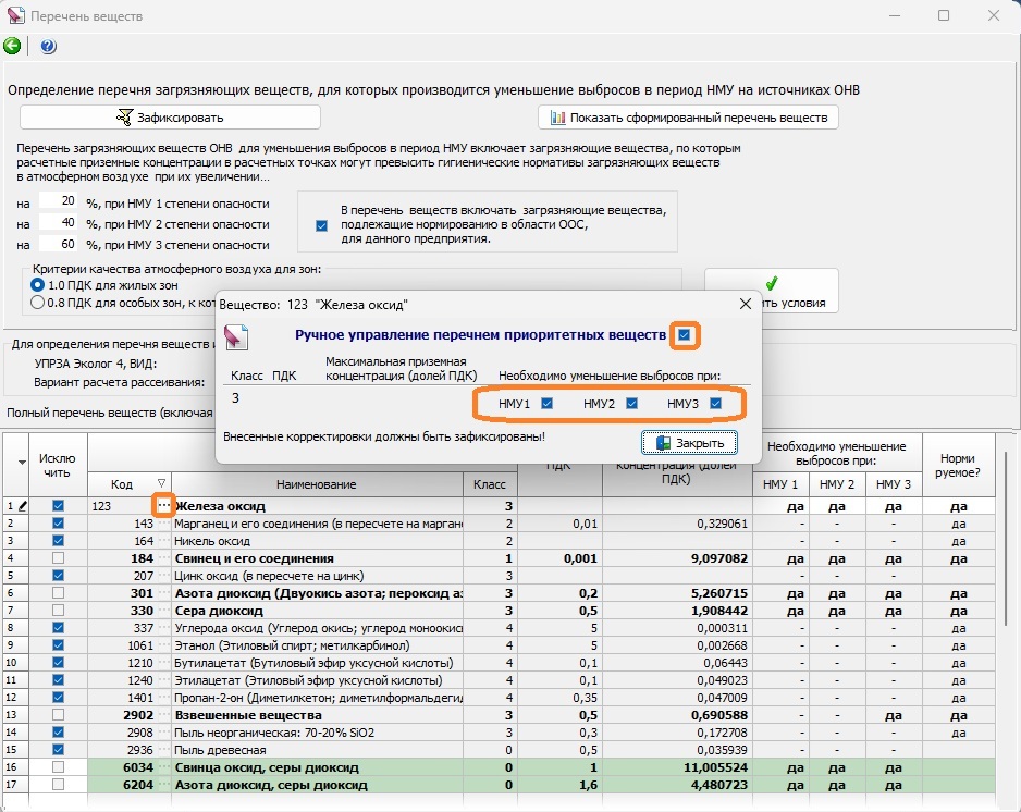 Для этого на этапе 1.2 работы с модулем "НМУ-Эколог" нужно принудительно добавить вещества в план мероприятий.