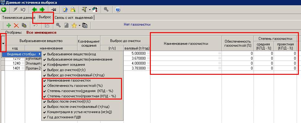 Как и в 3-й версии программы газоочистка устанавливается на конкретное вещество, на закладке выброс.
