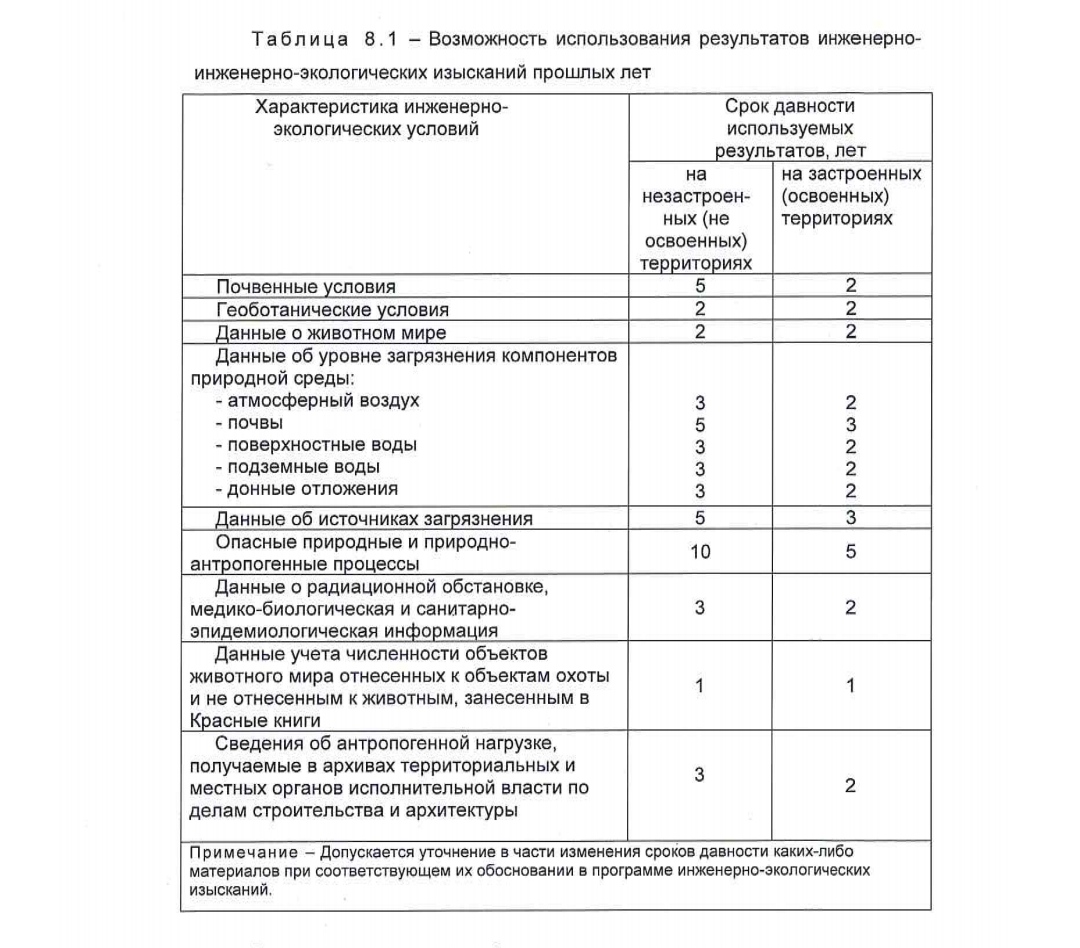 Далее смотрим заголовок в табл 8.1При выполнении инженерно-экологических изысканий необходимо использовать материалы инженерно-экологических изысканий прошлых лет (при их наличии) с учетом сроков давности материалов (период от окончания изысканий до начала проектирования) в соответствии с таблицей 8.1.
