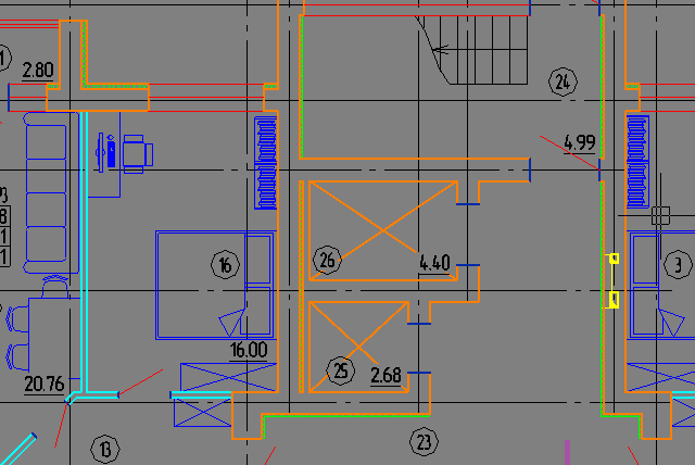 Вот участок плана: Между жильём и лифтом стена 380, утеплитель 50 и стена 120. Материал стен - полнотелый силикатный кирпич марки СУРПо-М150/F25/1,8 ГОСТ 379-2015 на цементно-песчаном растворе марки М75,