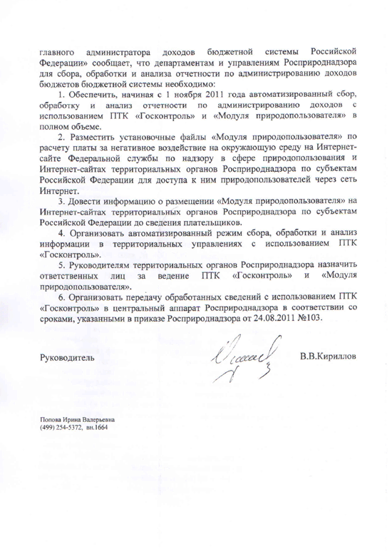 Письмо от 14.11.2011 №ВК-06-01-36/14762 "О дальнейших мерах по реализации полномочий при осуществлении функции главного администратора доходов бюджетной системы Российской Федерации" ПРОТИВОРЕЧИТ письму Росприроднадзора от 21.10.2011г. №ВК-08-02-36/13737 "О порядке установления (утверждения) нормативов и выдачи разрешений на выбросы", приложений к нему http://www.consultant.ru/document/cons_doc_LAW_122054/, письму Росприроднадзора от 07.12.2011г. №ОД-06-01-32/15903 "По обращению Скрыпника Б.А."