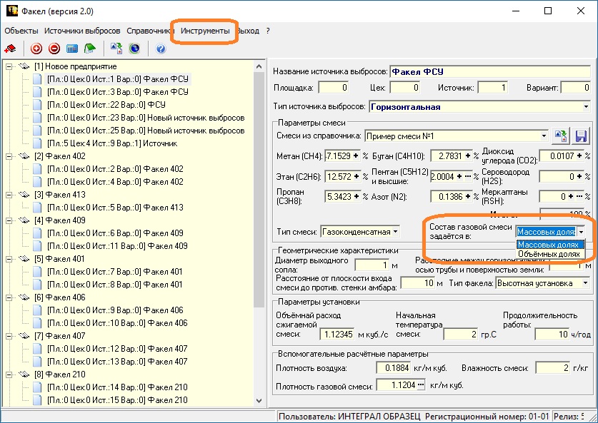 Состав смеси в массовых долях - не то. Нужно, чтобы можно было выбрать "расход сжигаемой смеси": объемный или массовый.