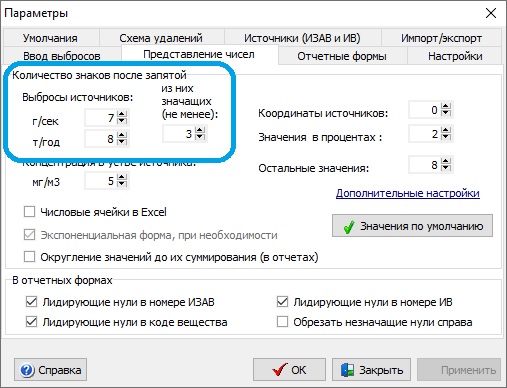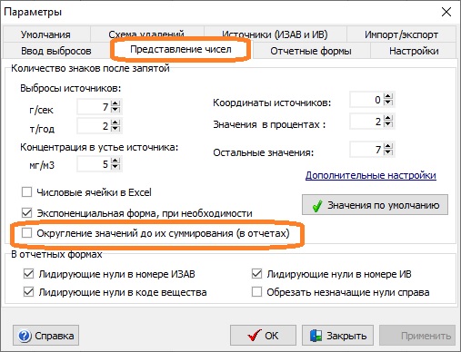 Так сделано, что бы сумма в колонках в таблице перечня веществ и нормативов всегда билась между собой. Если галочка не стоит, то суммируются точные значения слагаемых, а потом округляются значения. При таком подходе суммы не будут биться, но с математической точки зрения это подход верный; - возможность вывода экспоненциальной формы значений при 2-х знаках после запятой;