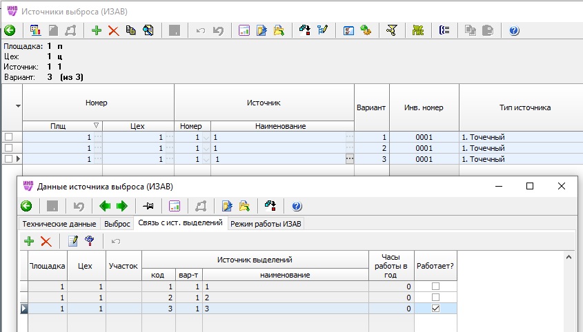 Нужна помощь с инвентаризацией при режимности работы источников выделения. Есть ИЗАВ 0001, на нем работает 6 ед оборудования (6 ИВ), каждая единица оборудоания работает строго по отдельности, все одновременно не работает. Как в программе инвентаризация интеграла корректно внести эти сведения, чтобы бланк ИЗАВ и суммарные выбросы формировались с учетом режимности работы ИВ. Т.е. т/год были суммарные, а г/с выбирался максимальный из работающих ИВ. А так же чтобы в дальнейшем в УПРЗА переносились корректные данные на рассеивание