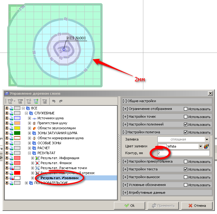 В документации возможности описаны, но их много, поэтому, если вдруг вы не знаете, то в новой графике есть возможность изменять толщину изолиний. Для этого в свойствах слоя "Результат. Изолинии" на закладке "Настройки полигона" нужно изменить параметр "Толщина" - он задаёт толщину изолиний в миллиметрах устройства отображения (принтера или экрана - неважно - везде будет заданная толщина в мм).