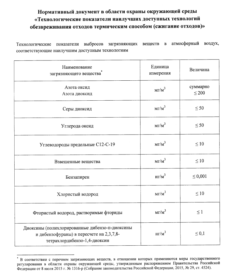 Ольга Николаева, исходя из упомянутого среднесуточное пороговое значение определяется путем измерения допустимых часовых значений за вычетом доверительного коэффициента. Все пороговые значения выбросов исчисляются при температуре 273,15 К, давлении 101,3 кРа после корректировок содержания водяного пара в отработанных газах и при стандартном содержании, равном 6% для твердого топлива, 3% для заводов по сжиганию, кроме газовых турбин и газовых двигателей, использующих жидкое и газообразное топливо, и 15% для газовых турбин и газовых двигателей. (см. Директива Европейского парламента и Совета Европейского Союза 2010/75/ЕС от 24 ноября 2010 г.) Это относится к концентрациям в отходящих газах и никак не связано с наличием либо отсутствием максимально-разовых и среднесуточных ПДК.