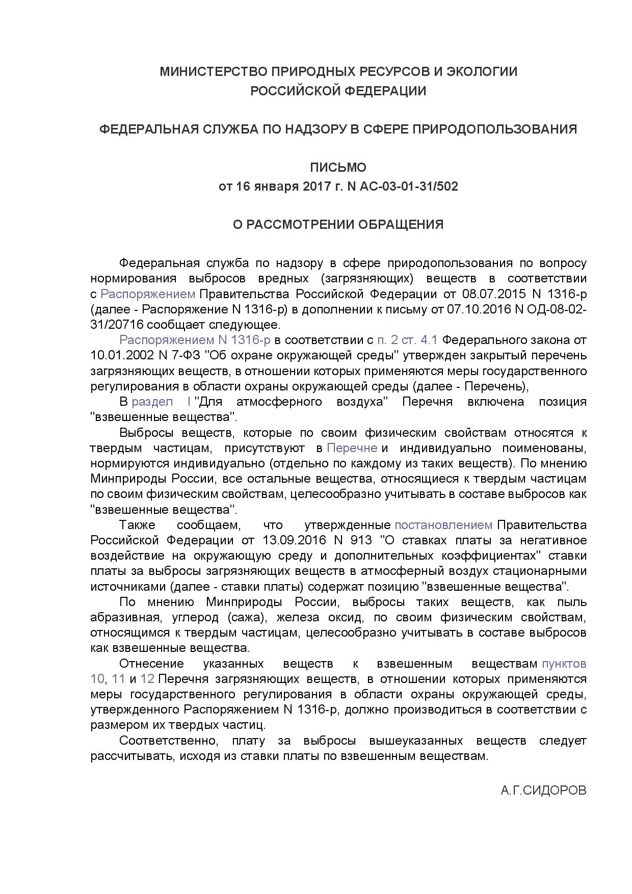 есть еще ПИСЬМО от 16 января 2017 г. N АС-03-01-31/502 это получается, что надо 2930, 328, 123 "...целесообразно учитывать в составе выбросов как "взвешенные вещества"..."? вот не понимаю я - их и в выбросах менять надо на взвешенные?