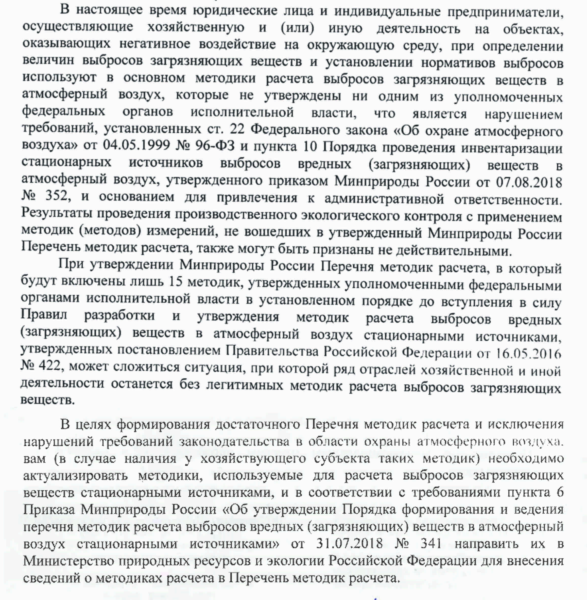 "Таким образом, при утверждении Минприроды России Перечня методик расчета, в который будут включены лишь 15 методик, утвержденных уполномоченными федеральными органами исполнительной власти в установленном порядке до вступления в силу Постановления № 422, может сложиться ситуация, при которой ряд отраслей хозяйственной и иной деятельности останется без легитимных методик расчета выбросов загрязняющих веществ."