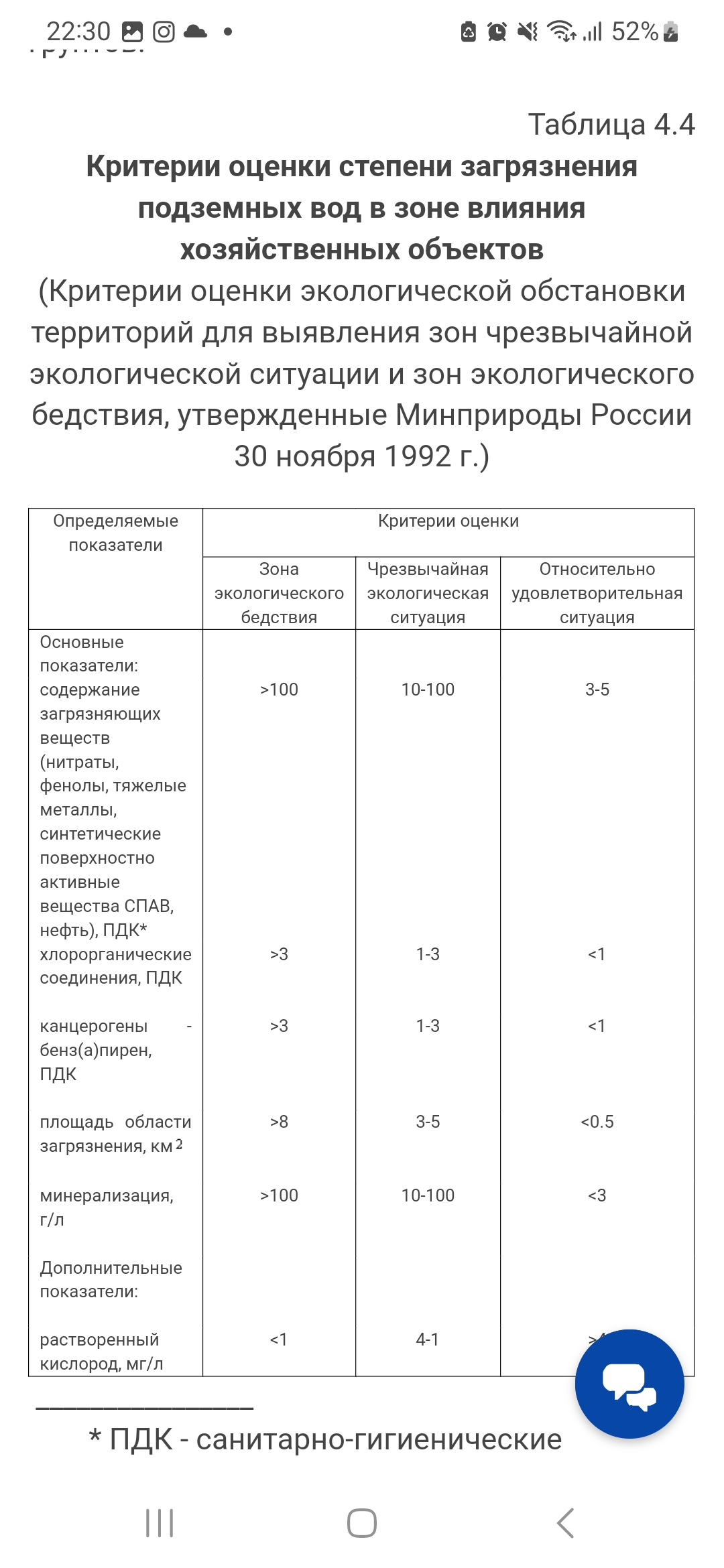 СП 11-102-97 п. 4.38 Оценку загрязнения грунтовых вод, не используемых для водоснабжения, на участках жилой застройки, а также в зонах влияния хозяйственных объектов следует производить в соответствии с таблицей 4.4.
