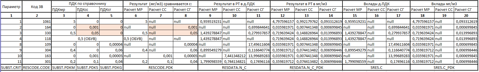 во всех прочих случаях СС и СГ концентрации в мг/м3 сравниваются в ПДКсс и ПДКсг соответственно. Если ПДК не установлена, в колонку записывается null.