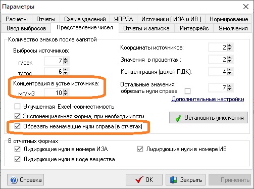 Влияет настройка "Концентрация в устье источника". Можно увеличить и поставить галочку, что бы незначащие нули обрезались. Планируем в дальнейшем отказать от округления ПДК в отчетах вообще.kakoytobes писал(а): 11 дек 2021, 19:35 Мб как-то еще можно пофиксить, а то проморгал округление для марганца - получил отказ за неправильный ПДК в табличке?