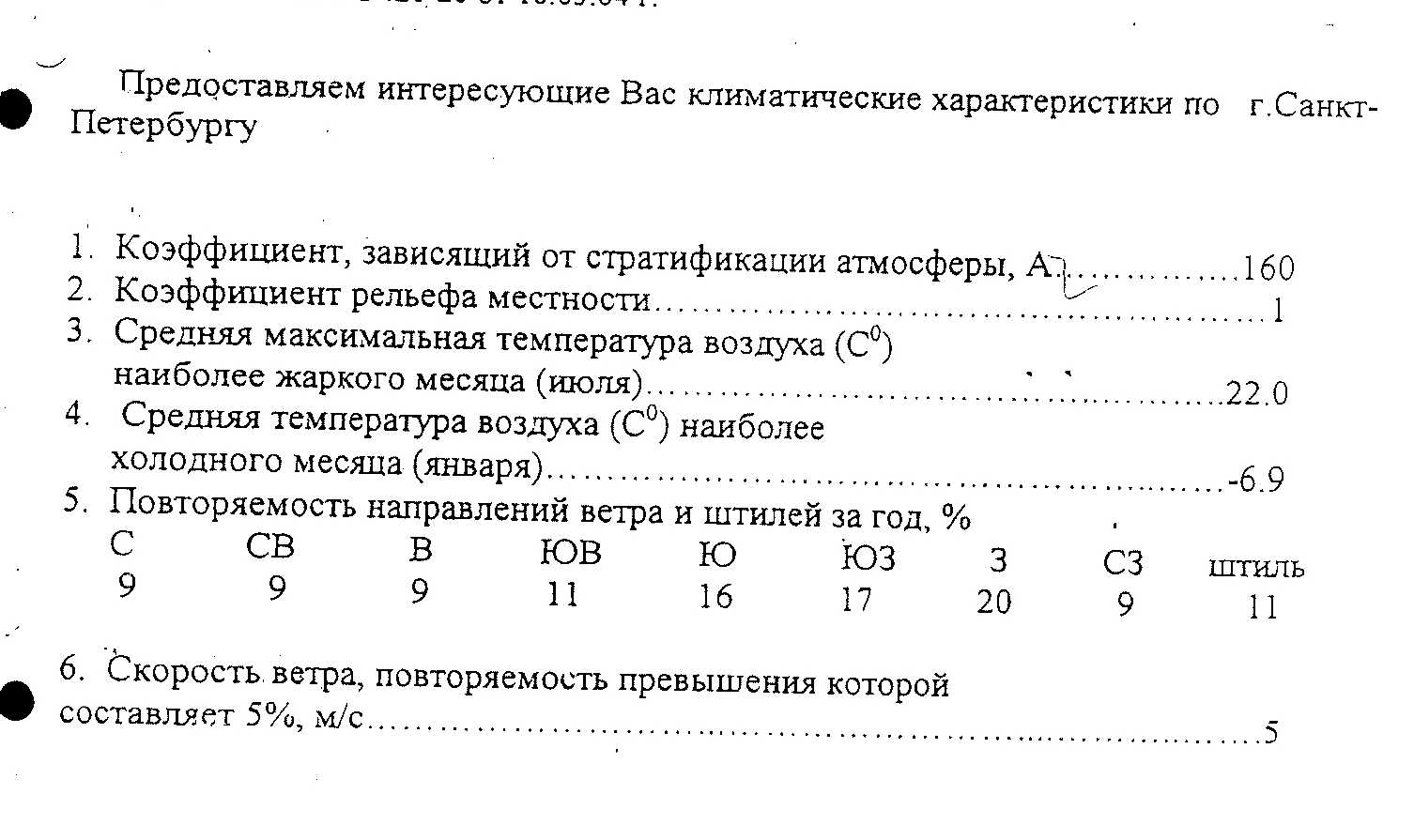 Скорость ветра, повторяемость превышения которой по многолетним данным составляет 5%, м/с 6,0