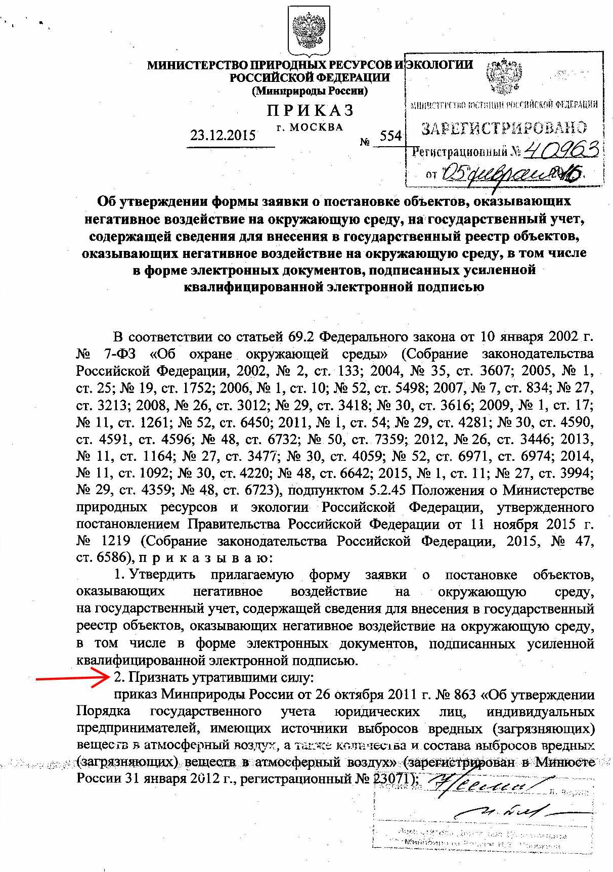 Опубликовали Приказ Минприроды РФ от 23.12.2015 № 554 "Об утверждении формы заявки о постановке объектов, оказывающих негативное воздействие на окружающую среду, на государственный учет, содержащей сведения для внесения в государственный реестр объектов, оказывающих негативное воздействие на окружающую среду, в том числе в форме электронных документов, подписанных усиленной квалифицированной электронной подписью".