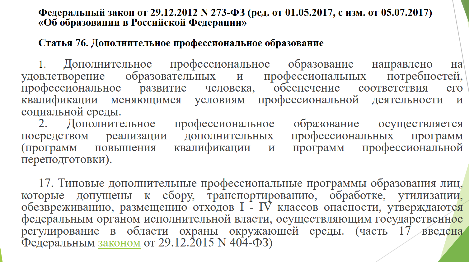 3. Профессиональное обучение и дополнительное профессиональное образование лиц, которые допущены к сбору, транспортированию, обработке, утилизации, обезвреживанию, размещению отходов I - IV классов опасности, осуществляются в соответствии с законодательством об образовании.