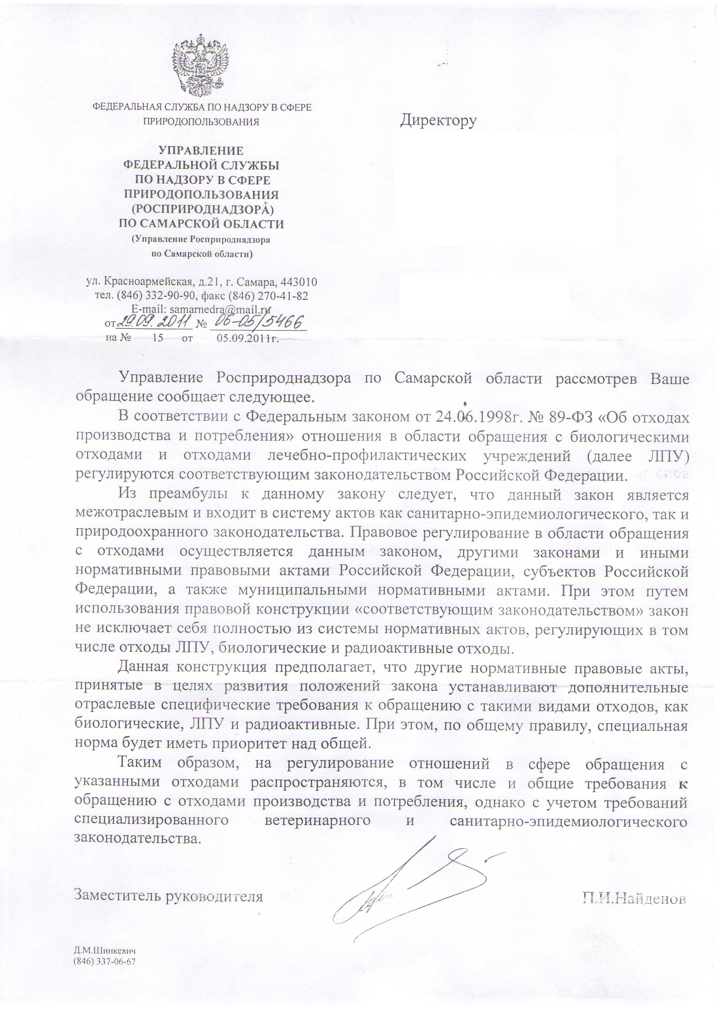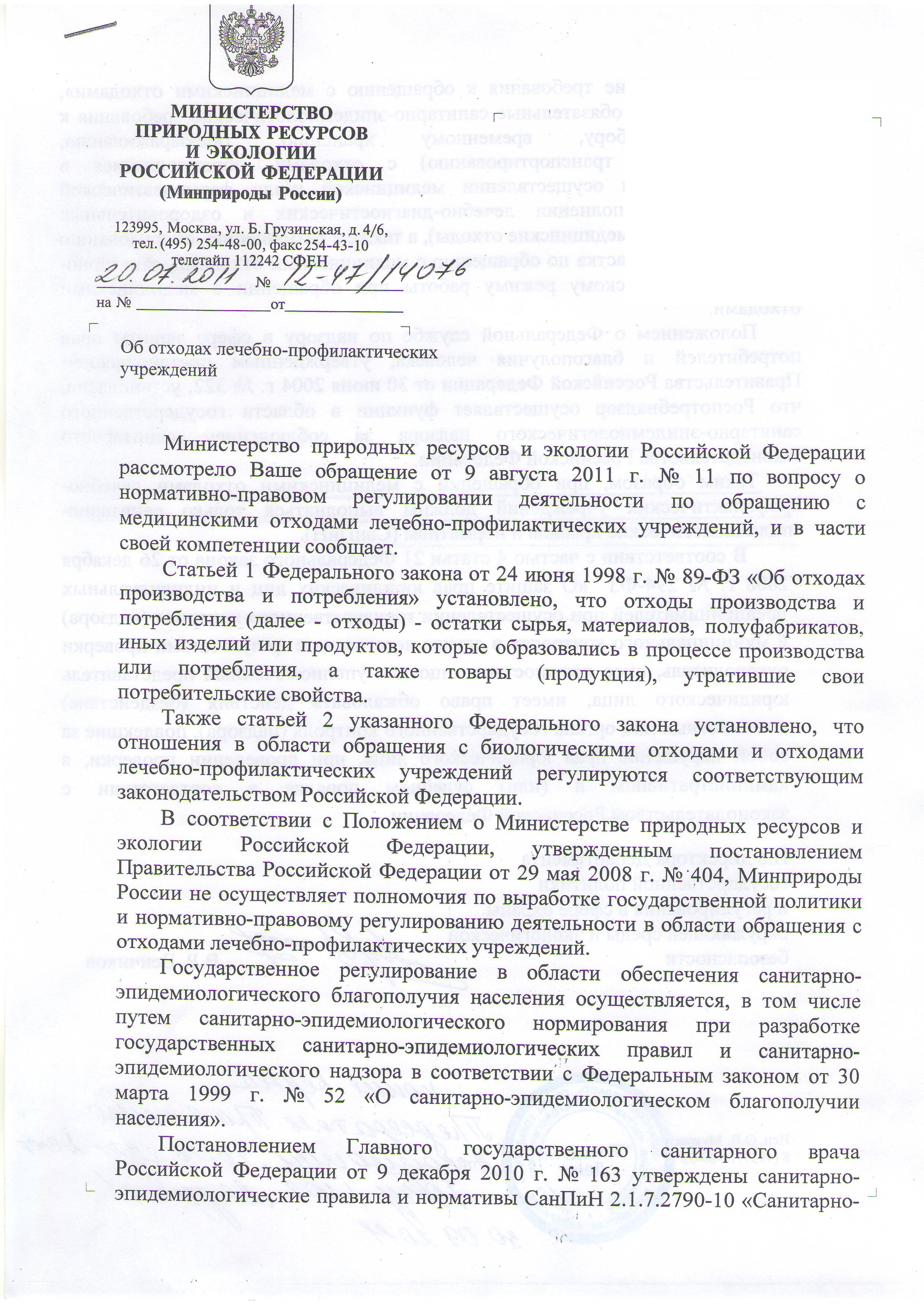 " ...В соответствии с Федеральным законом от 24.06.1998 г. №89-ФЗ "Об отходах производства и потребления" отношения в области обращения с биологическими отходами и отходами лечебно-профилактических учреждений регулируются соответствующим законодательством Российской Федерации.