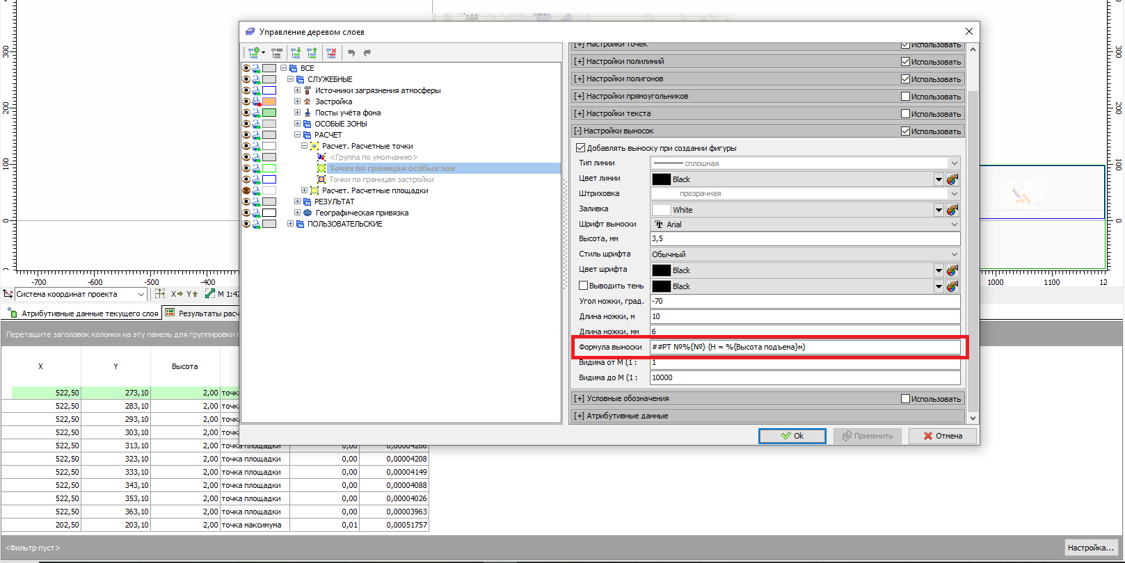 Необходимо в выносках с результатами расчёта "Эколог-Шум 2.2" изменить формулу выноски. Графический модуль "Базовый". Сейчас программа выдает значения в точках в формате "40,1 дБА (Н=1,5 м)". При выводе на печать выноски налезают друг на друга, при корректировке места расположения надписи с результатом расчёта вручную, приходится выводить расчёт для каждой частоты по отдельности (по какой-то причине изменение расположения сохраняется только для одной частоты). Можно ли изменить форму выноски на "40,1 дБА" без высоты и как это сделать? Попробовала вносить изменения в формулу выноски в программе - на выноске это никак не отобразилось, хотя на выносках, к примеру, обозначений расчётных точек всё работает.