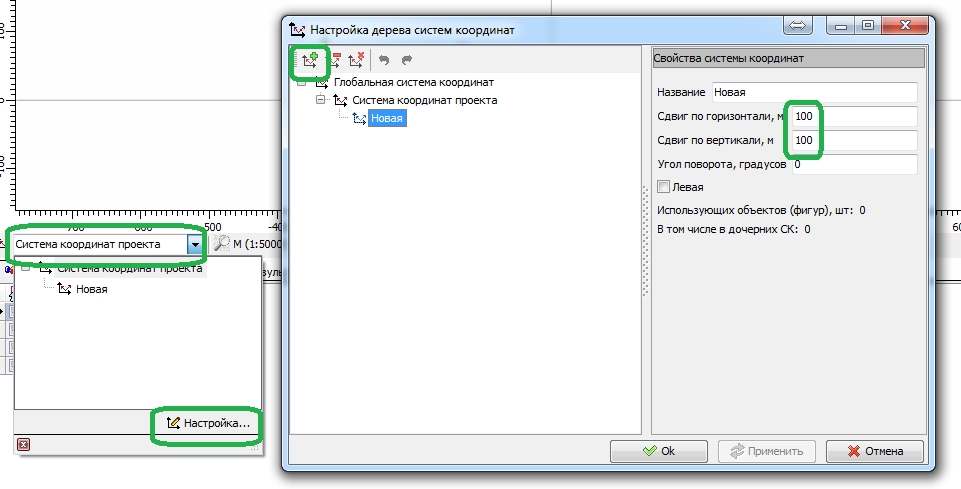 2. Создать в файле новую систему координат, задать ее сдвиг в соответствии с тем, как нужно переместить элементы карты (см. рис). 3. Выбрать нужные элементы и выбрать для них созданную систему координат. Элементы автоматически переместятся по карте. Рекомендуем сначала поэкспериментировать с копией файла карты.
