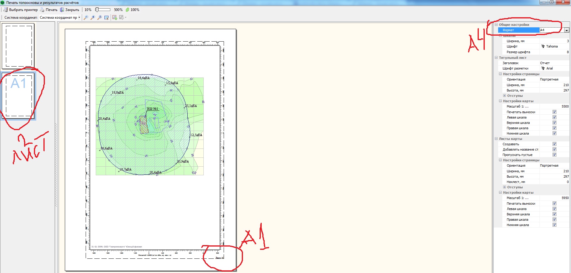 1) Ставлю в общих настройках формат А4 (принтер печатает только А4 у меня) , но как видно на скрине на фоне топоосновы показывается А1 , при печати тоже написано А1, как так ? непонятно.