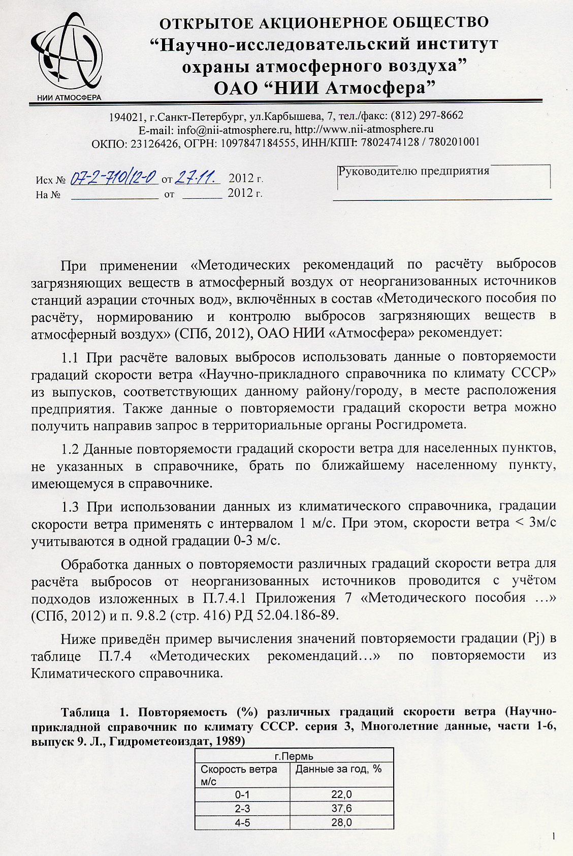 Письмо НИИ Атмосфера №07-2-710\12-0 от 27.11.2012.