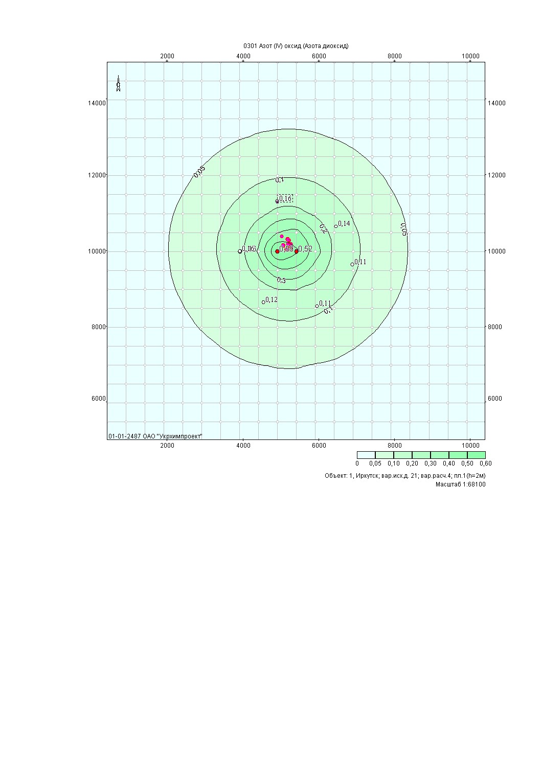 Уважаемые экологи запуталась: чему равна зона влияния диоксида азота (в м)на этой картинке(поясните,пож.)Шаг сетки 500м.