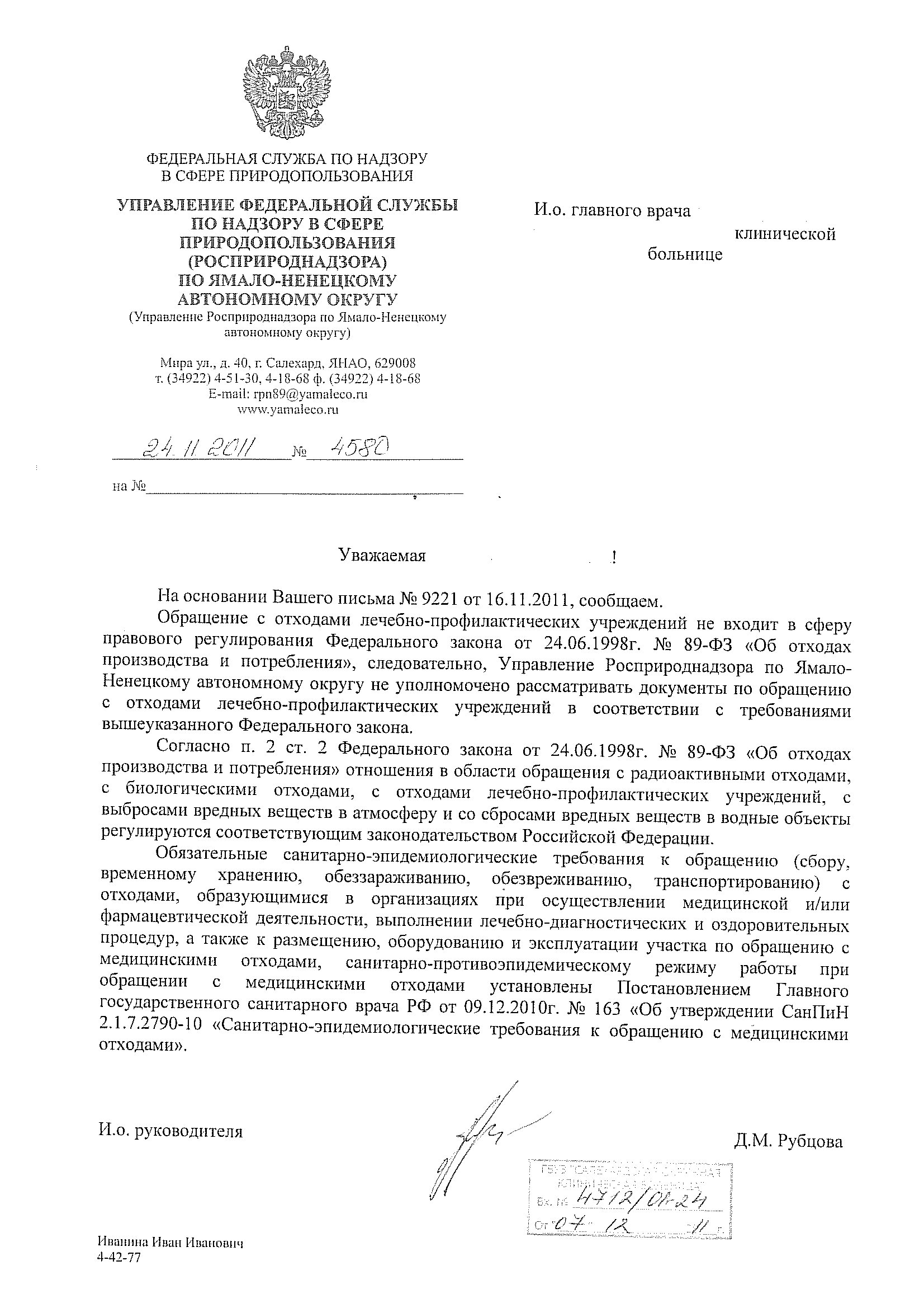 А вот какой ответ мне прислал РПН, когда я спросила по поводу передачи отходов исключительно лицензированным предприятиям, ведь ФЗ об отходах производства и потребления на медицинские отходы не распространяется, а в СанПиНе по этому поводу тоже нет ни слова (кроме класса Г).