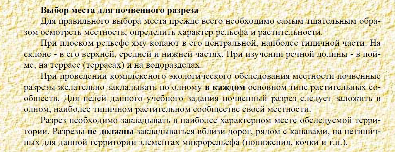 Чем регламентирует выбор места для заложения почвенных разрезов.