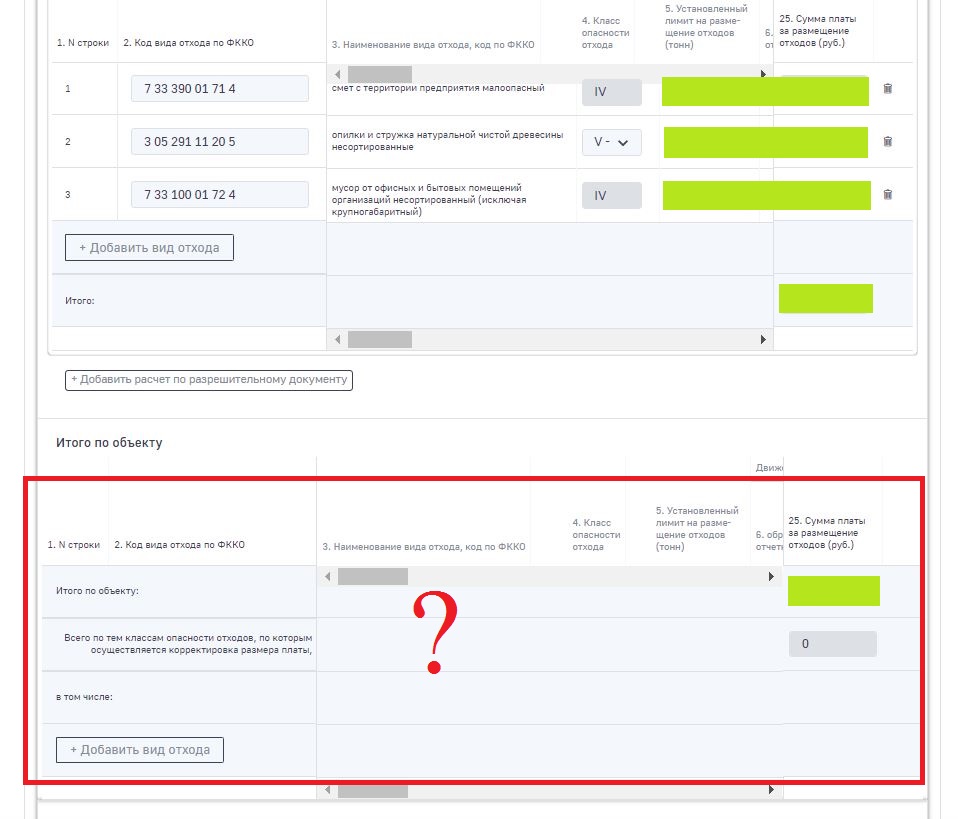 Тоже самое наблюдаю... но ошибки остаются. Итоговая сумма для внесения если я правильно понял должна отобразится в автоматическом режиме по строке 150 ну и соответственно ниже разбивается уже по видам негативного воздействия, так вот у меня по строке 150 и ниже стоят нули... Ну и старая песня, мой безкатегорийный объект так и считается только в ПРЕДЕЛАХ ЛИМИТА)))) что бы я не делал. И раздел по размещению отходов так и не сохраняется... 50% и хоть что делай, все перепроверил, даже полностью заново перезабил все цифры и данные, бесполезно...Sanya101 писал(а): 20 фев 2020, 05:38 Переделали раздел Итоги, теперь один ОКТМО - одна страница.