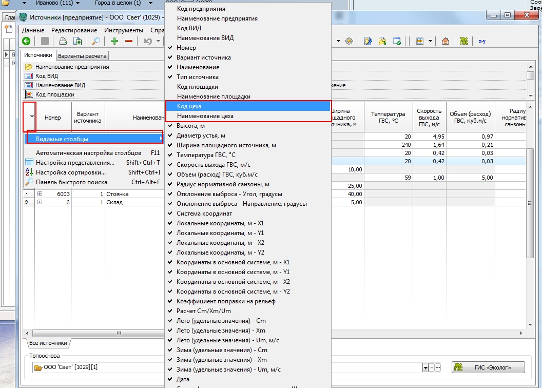 Я поняла как добавить наименование площадки и наименование цеха в таблицу, но не пойму как выбрать нужный цех. Я щелкую по строке в столбце цех и меня выкидывает на выбросы источника. Объясните пожалуйста как выбрать нужную площадку и цех.
