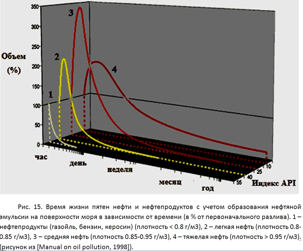 Еще в одной из статей нашел следующие данные "Попавшая в воду океана нефть подвергается воздействию природных факторов (ветер, течения, приливы и отливы), происходят испарение, растворение, эмульгирование, усвоение живыми организмами, химические и фотохимические превращения. Скорость распространения нефти на поверхности моря составляет 60 % от скорости течения и 2–4 % от скорости ветра. При дрейфе нефтяного пятна загрязняются все новые порции воды. Испарение интенсивно в течение первого получаса после разлива, когда нефть можно поджечь, позже на поверхности моря остается мало летучих соединений. К концу 1 суток испаряется 50 % соединений с С13–С14, к концу 3-ей недели — 50 % соединений с С17".