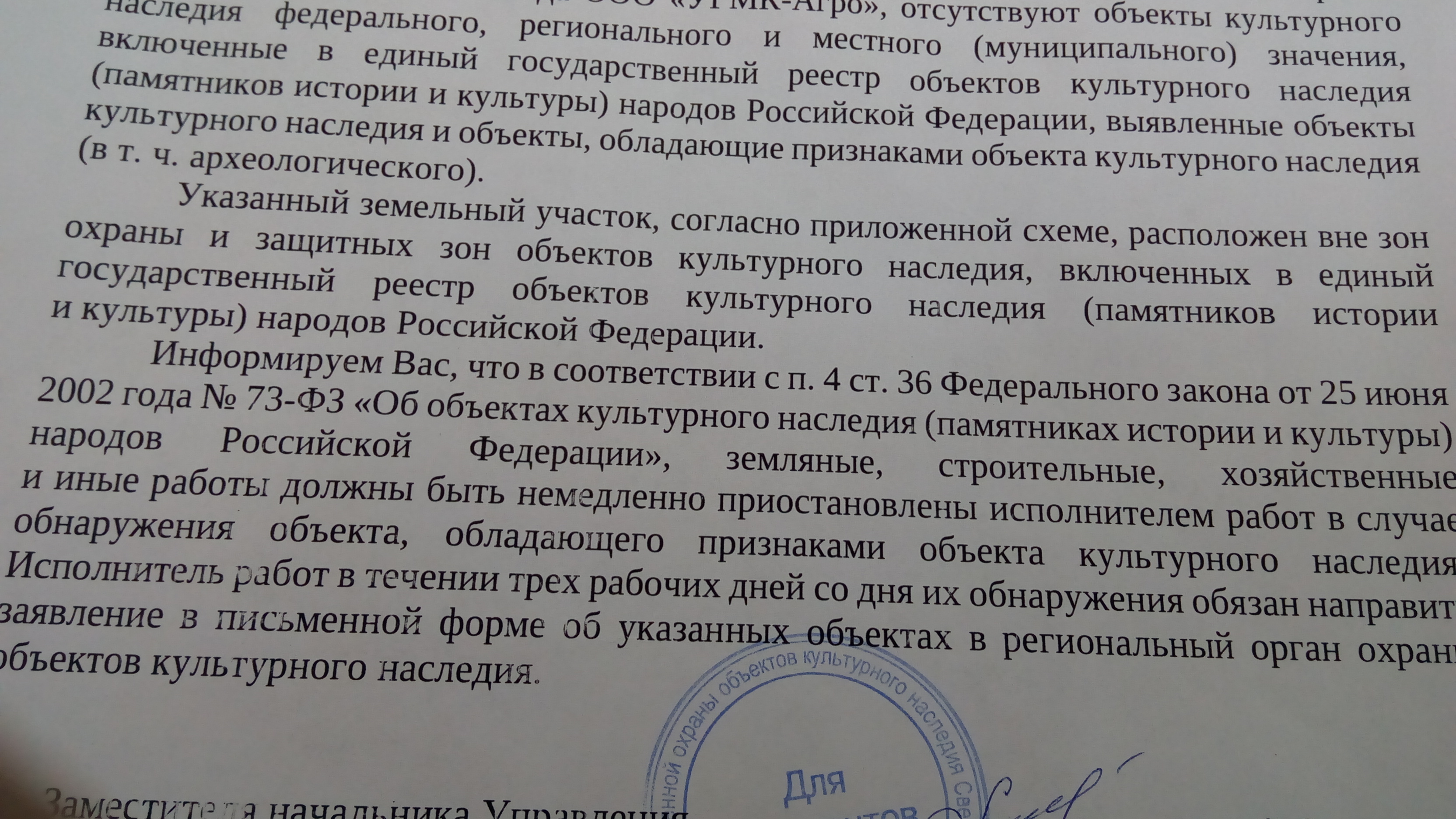 " На запрашиваемых территориях объекты культурного наследия (включая объекты археологического наследия), включенные в Единый гос.реестр объектов культурного наследия народов РФ, выявленные объекты культурного наследия и объекты, обладающие признаками объекта культурного наследия, отсутствуют" .