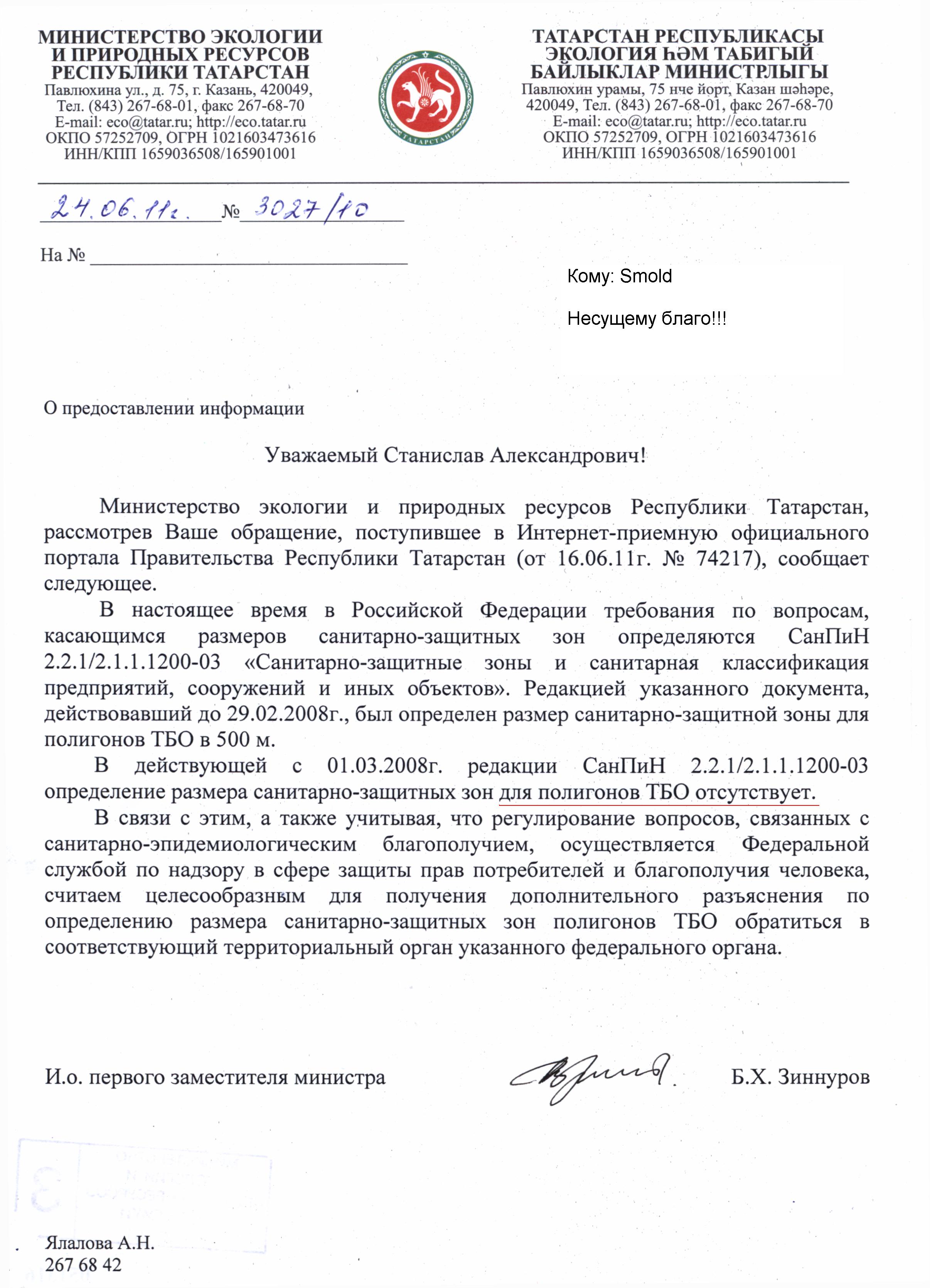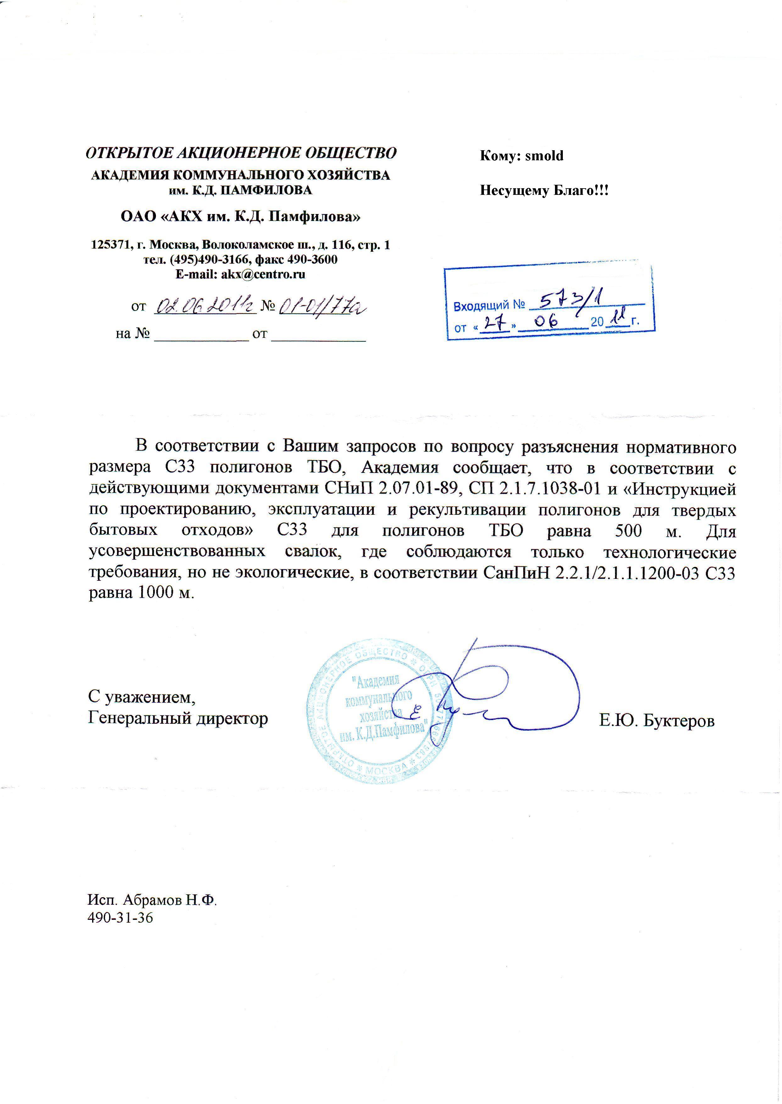 Сегодня получил на руки положительное заключение территориального органа государственной экологической экспертизы, где сказано что в "Суперсанпине" 2.2.1/2.1.1.1200-03 размер ориентировочной СЗЗ для полигона ТБО не установлен. и согласно СП 2.1.7.1038-01 размер СЗЗ от жилой застройки составляет 500м. (ссылаются на полученное письмо "АКХ" см. выше)