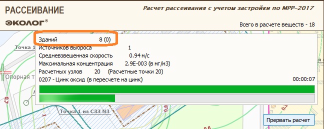 Обратите внимание, что при расчете рассеивания в окне с прогрессбаром есть информация о том сколько зданий в базе данных и сколько их используется в расчете.