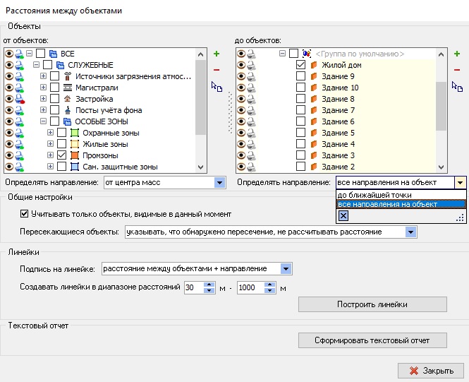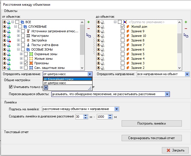 - Инструмент измерения кратчайших расстояний между объектами с возможностью построения линеек на карте. Например, расстояние от источника до изолинии 0,05 ПДК.