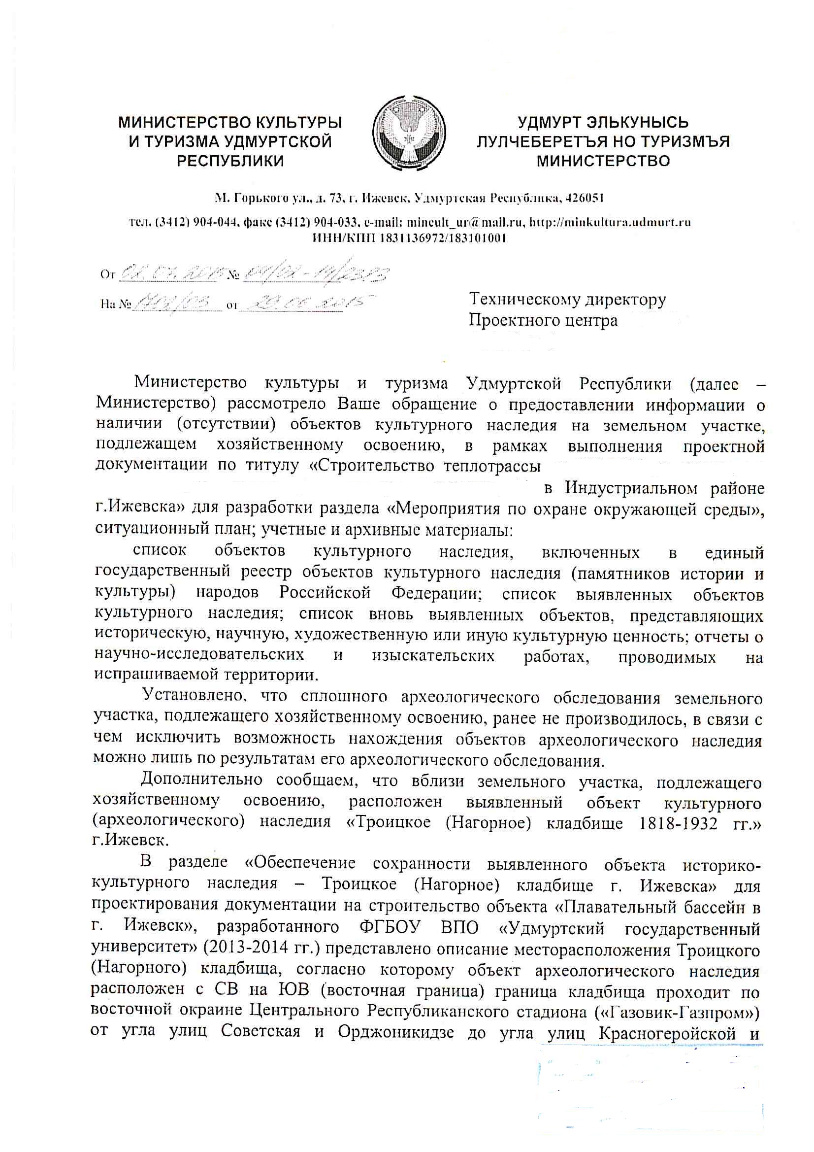 Доброго дня. Пришел ответ из Минкультуры Удмуртии. Руководитель проекта в ахе.))) Нужны ли археологические исследования??? Ведь строительство теплотрассы между жилыми домами, рядом с общагами, магазинами и длина всего 580 м. Трасса характеризуется густой сетью подземных коммуникаций, строений, наличием асфальтированных пешеходных дорог и проезжих частей улиц, а так же автомобильных дорог.