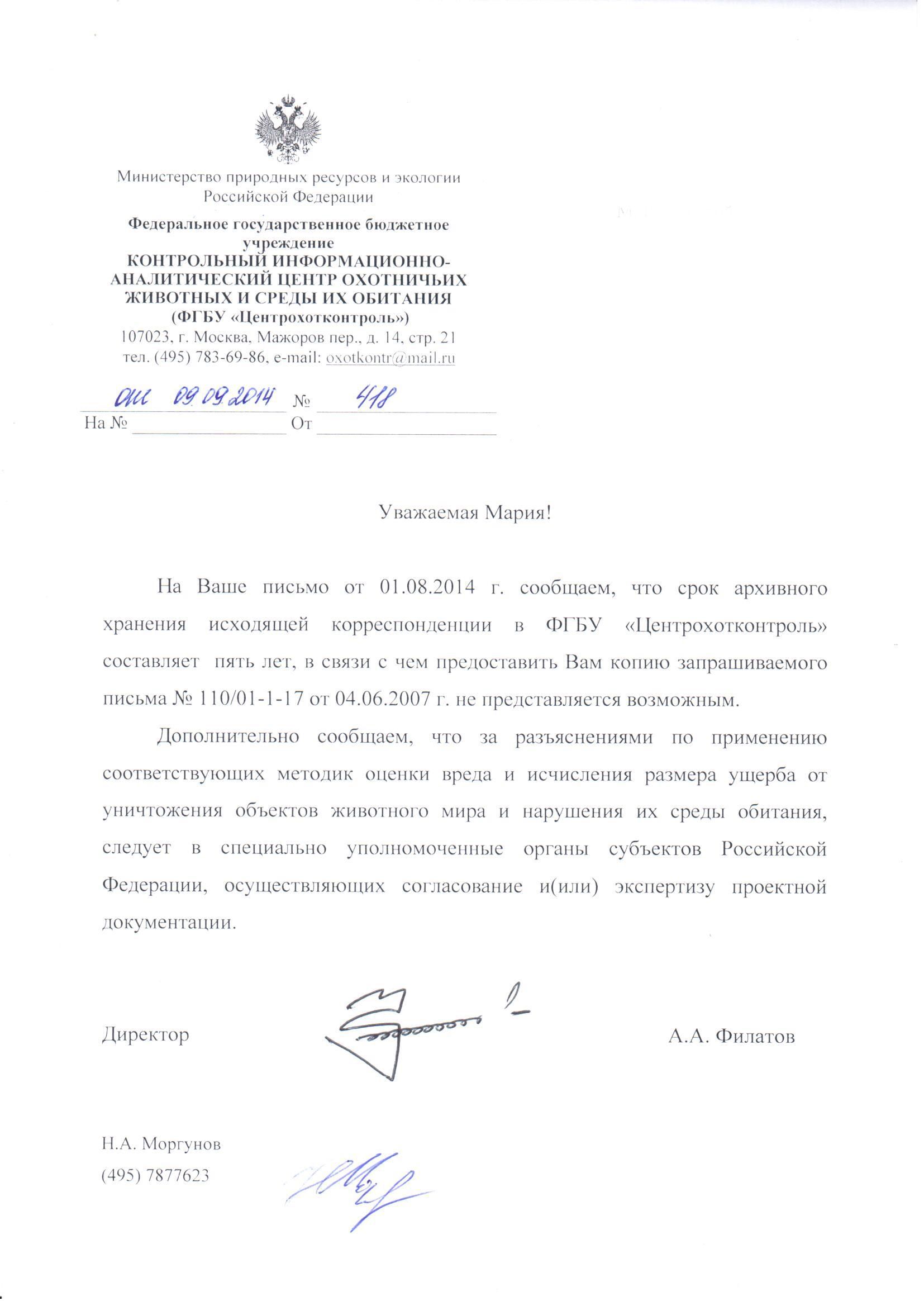 Разыскивается письмо ФГУ "Центрохотконтроль" (подписано директором ФГУ А.В. Проняевым) директору ВНИИ природы В.В. Тихомирову исх. №110/01-1-17 от 04.06.2007 (ответ на исх.02-26/177 от 23.05.2007). Может, у кого-нибудь есть - поделитесь, пожалуйста. :)