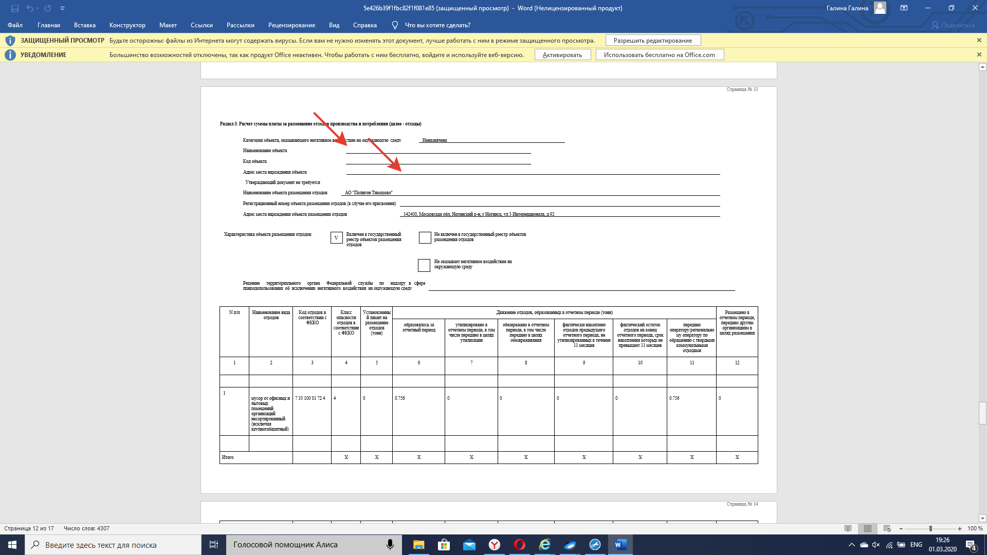 Добрый вечер. Подскажите пожалуйста, при выводе печатной формы декларации по некатегорийному объекту не заполняется в разделе 3 "Расчет суммы платы за размещение отходов производства и потребления" "Наименование объекта" и "Адрес места нахождения объекта". При заполнении этого же 3 Раздела при выборе "вывоз отходов с некатегорийного объекта" программа не дает возможность вручную заполнить наименование и адрес объекта НВ.