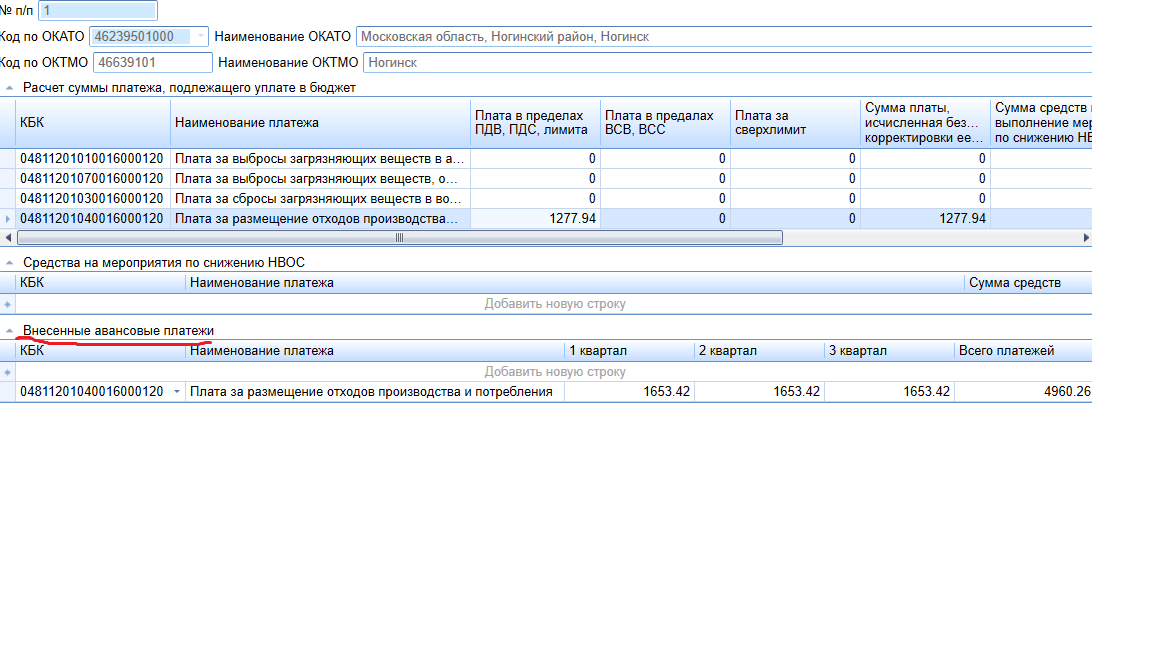 В декларации вроде в модуле написано именно внесенные авансовые платежиNemo13 писал(а): 28 фев 2018, 22:30А зачем вбивали квартальные расчеты? Платите 1/4 платы за предыдущий год, а затем в расчете платы щелкаете по ОКАТО и вбиваете суммы авансовых по соответствующему виду воздействия.