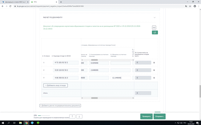 именно так и нужно сделать: посчитать отдельно, какая масса ЗВ образовалась у вас за каждый период (январь - сентябрь и октябрь - декабрь), и занести эти данные в ЛК в период без нормативов и с нормативами (декларацией) соответственно. у меня такая же ситуация, я просчитывала массы ЗВ в экселе с точностью до дня и затем вносила их в ЛК. Это раньше Модуль природопользователя сам считал лимит и сверхлимит, ЛК этого (пока?) сделать не может, приходится самому.Mary88 писал(а): 03 мар 2020, 10:03 У меня такой вопрос - заполнила раздел 1 "период без утвержденных нормативов" (с января по сентябрь) затем расчет по Декларации о воздействии на ОС. Программа считает в периоде без утверждения весь годовой объем выброса как сверхлимитный, затем тоже самое по лимиту (с сентября по декабрь), связки двух документов не произошло... Ранее (в слетевшей форме) расчет был частично по нормативу, частично без.