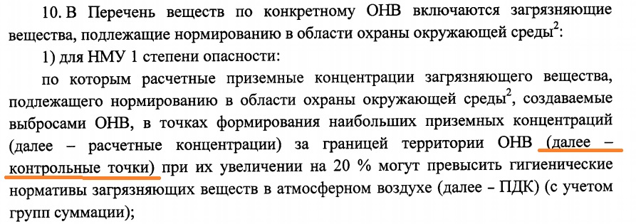 В п. 10 вводится понятие "контрольные точки". за границей территории ОНВ. А в п. 11 дается пояснения где именно должны быть взяты эти контрольные точки. На основании расчета рассеивания, который Вы делали для ПДВ (НДВ), Вы могли по карте определить точки внутри жилых и особых зон, в которых концентрация наибольшая. Принять эти точки в качестве контрольных, при расчетах рассеивания для НМУ. Безусловно точность определения таких точек будет зависеть от шага расчетной площадки.