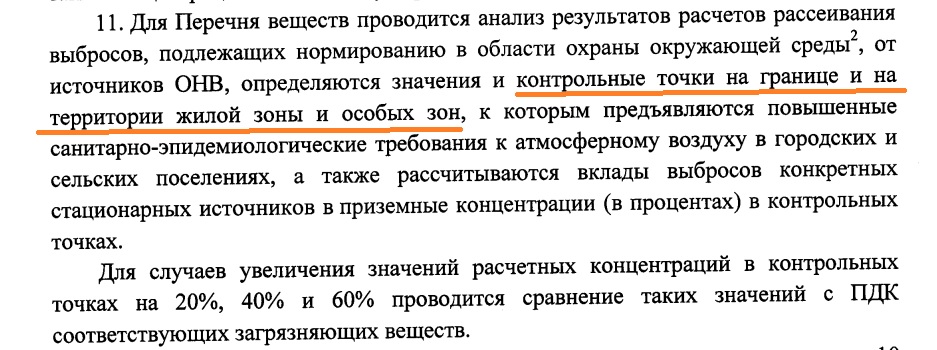 В соответствии с п. 11 Приказа Минприроды России № 811 при выполнении расчетов рассеивания значения концентраций загрязняющих веществ определяются в контрольных точках, принятых на территории жилых и особых зон, к которым предъявляются повышенные экологические требования, если нет иных требований, установленных нормативными правовыми актами субъектов Российской Федерации в области регулирования выбросов в период НМУ. Для ОНВ, расположенных в условиях сложившейся градостроительной ситуации, контрольные точки на границе нормируемых объектов могут совпадать с контрольными точками, принятыми на границе санитарно-защитных зон данных хозяйствующих субъектов.