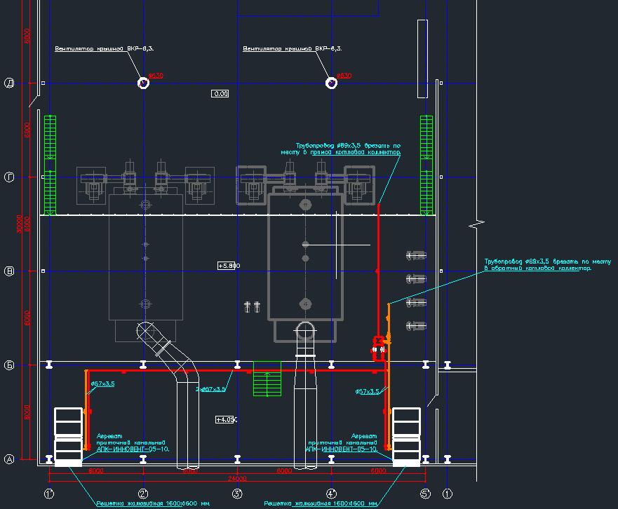 2) Если вытяжная вентиляция осуществляется через крышные вентиляторы, то почему к приточным агрегатам подходят 2 воздуховода, с противоположно-направленными потоками? Или они одновременно и приточные и вытяжные? (красный и желтый воздуховод)