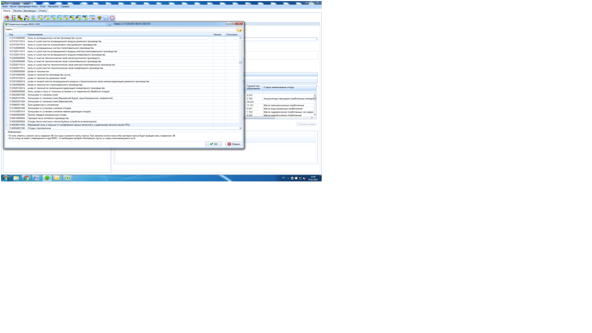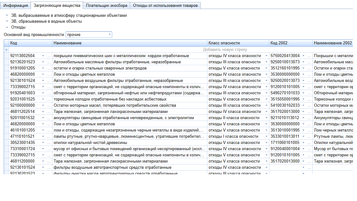 Добрый вечер ! попробуйте поменять коды ФККО именно в самом реестре , выбирайте плательщика , далее, открывайте вкладку загрязняющие вещества, отходы (см. в скриншоте). Тут коды все изменяются.ekologinya писал(а): 07 мар 2018, 12:02Подскажите, есть возможность в модуле справочник ФККО 2002 заменить на новый? Модуль обновлен до последней версии.
