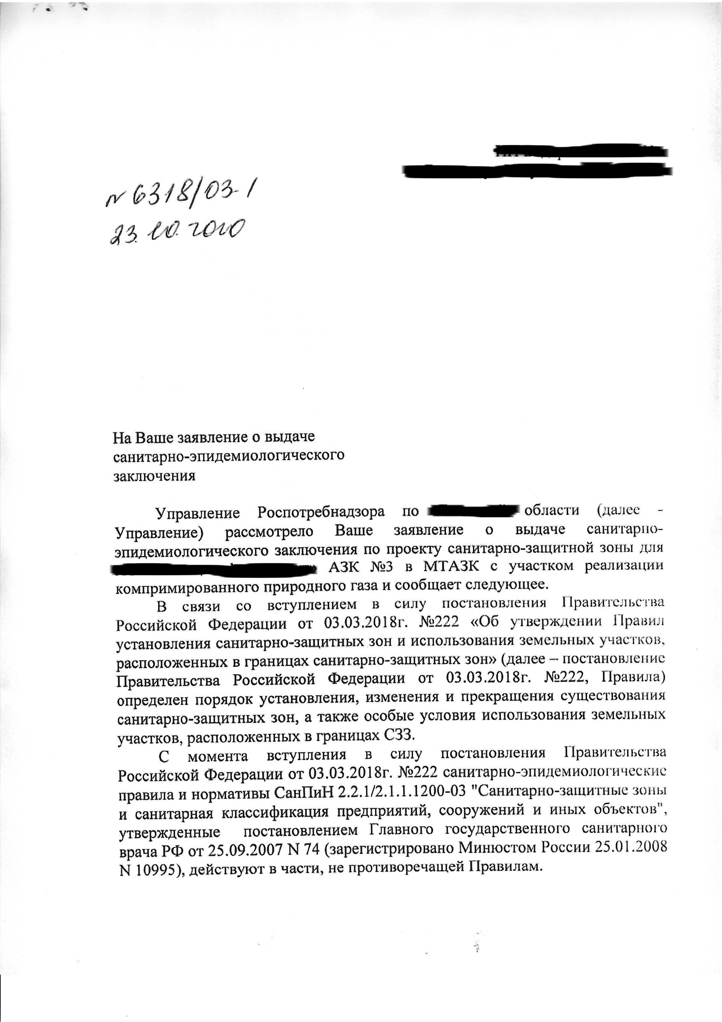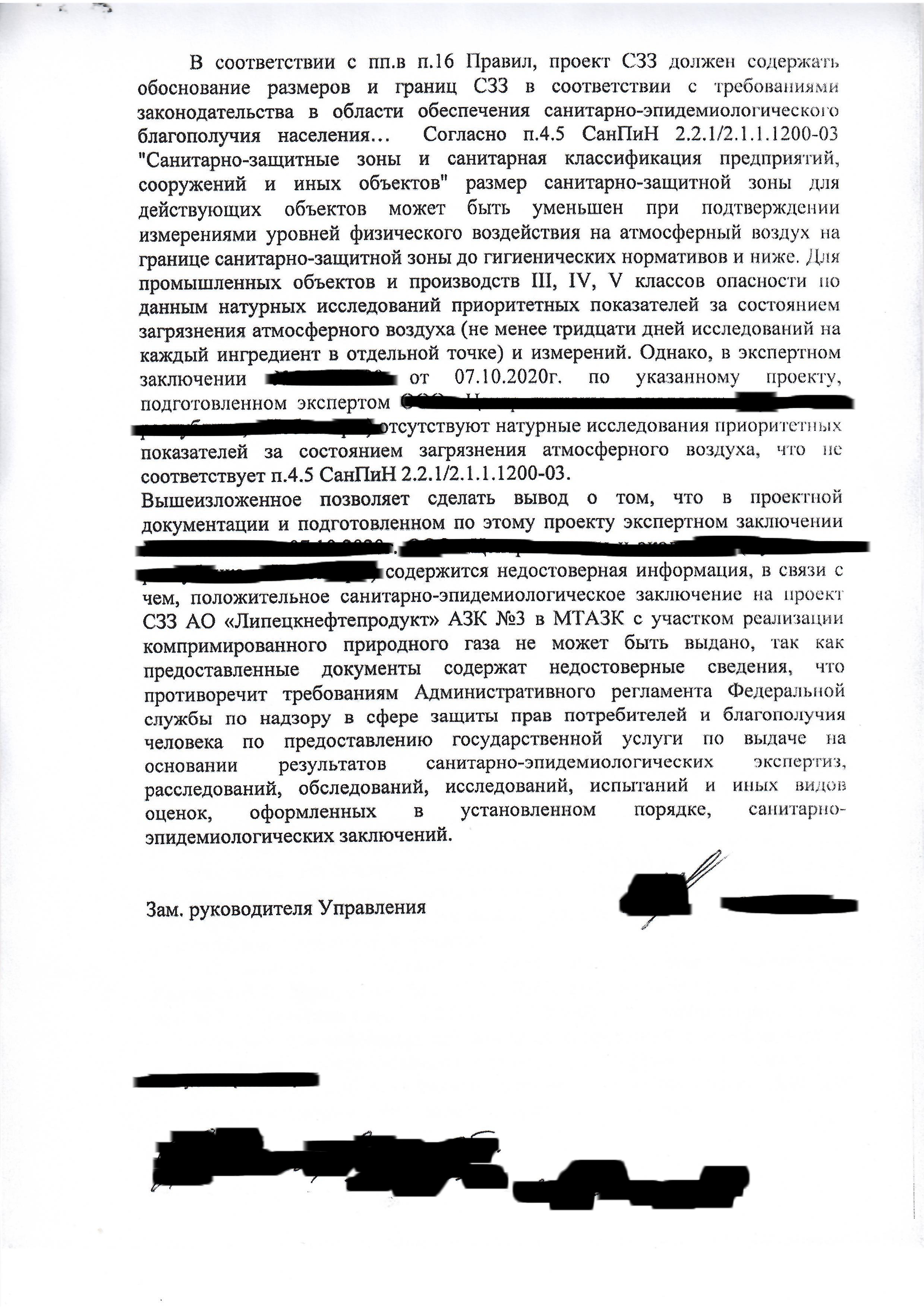5) Роспотребнадзор выдал отрицательное сан.-эпид. заключение (не соответствует), мотивируя, тем, что отсутствуют натурные исследования (мониторинг). Копию письма с отказом прилагаю.