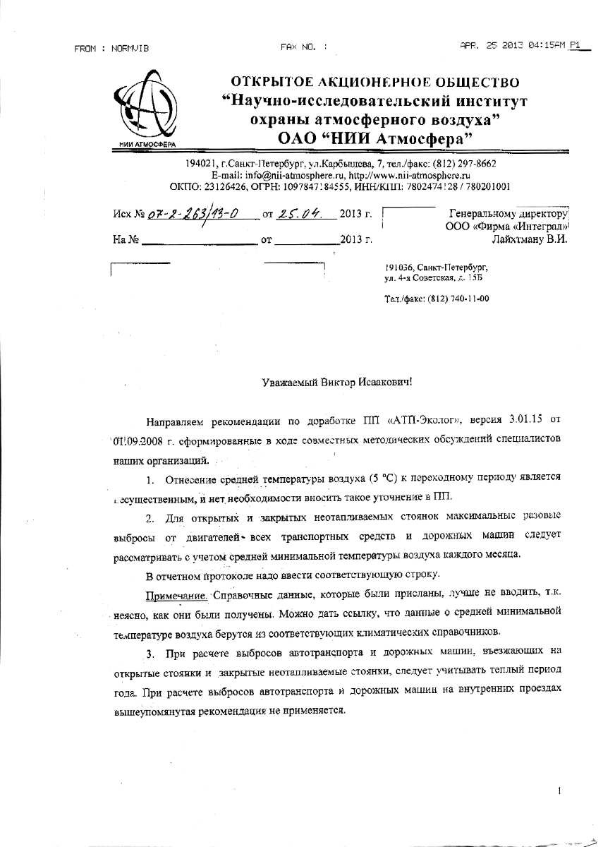 А что за письмо НИИ Атмосфера N07-2-263/13-0 от 25.04.2013?