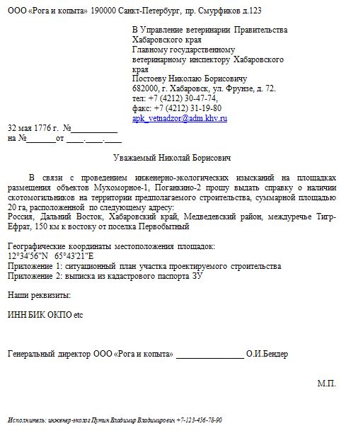 На Ваш запрос от ... №... сообщаю, что на территории ... района ... края находятся 14 сибиреязвенных скотомогильника, в том числе и на территории поселений изыскиваемого участка трассы магистрального нефтепровода ... В связи с тем, что отсутствуют точные географические координаты данных скотомогильников, запрашиваемая Вами справка не может быть выдана. В настоящее время Управлением Россельхознадзора по ... краю проводятся мероприятия по уточнению географических координат сибиреязвенных скотомогильников