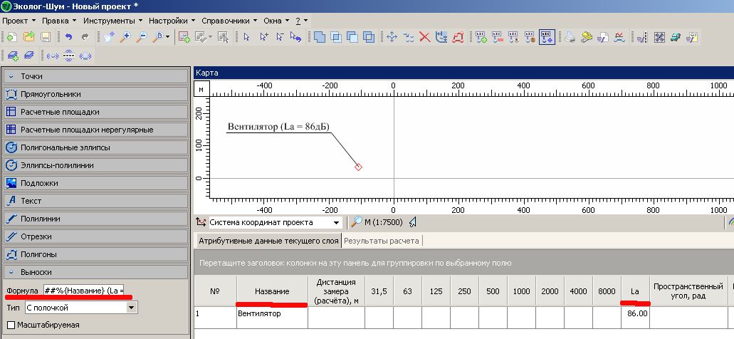 характеристики La = 86дБ, в качестве выноски будет выведено: