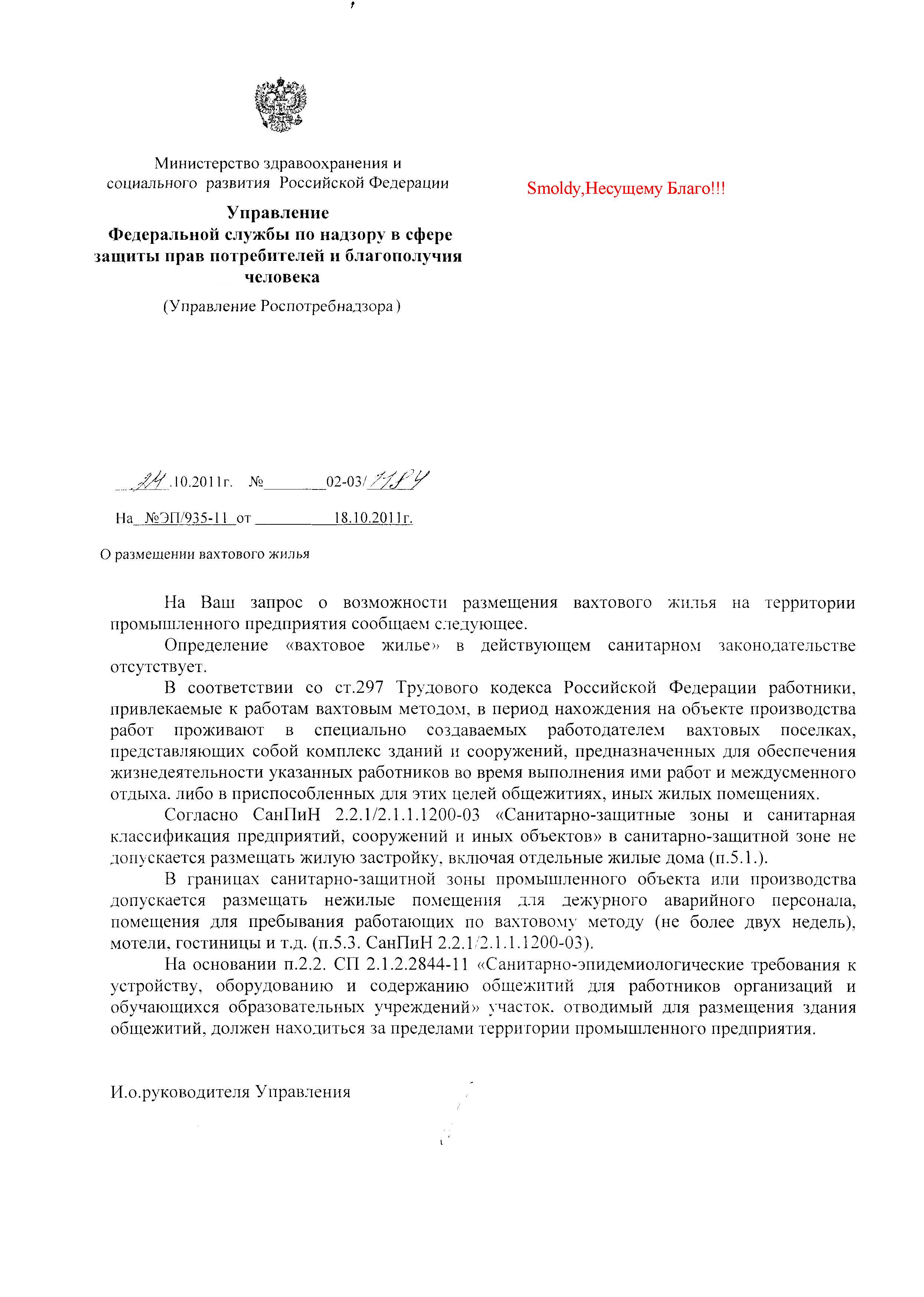 Вот 1-ое письмо, думал что согласятся, ан нет....Запретили строить вахтовое жилье на территории завода [mebiro]smold писал(а):отписал в 2 территориальных РПН (для контроля) в этом же духе, опираясь на законодательство (все в мою пользу)....жду ответа....опять наверно упрутся рогом