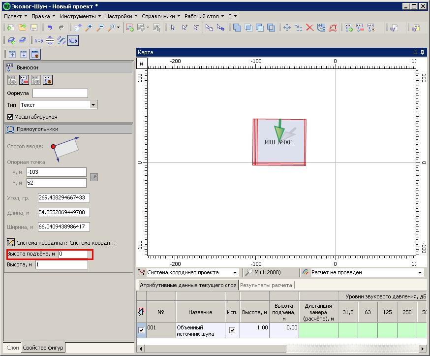 создаю нужную промзону с высотой подъёма минус 30 м, вношу источники шума с высотой минус 30 м;