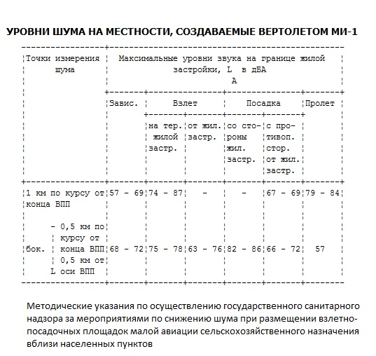 На данную табличку еще бы печатку от РПН - цены бы не было. Такой уровень шума от вертолета, который уже четверть века как "труп". МИ-1... Я плякаль... Когда взял в реале параметры по шуму от МИ-8 - тут же написал в ПМООСе, что вертолетик- прилетел-улетел, и к производственному процессу непричастен... :). И по шуму, и по выхлопу. Ибо - иначе смерть проекту...