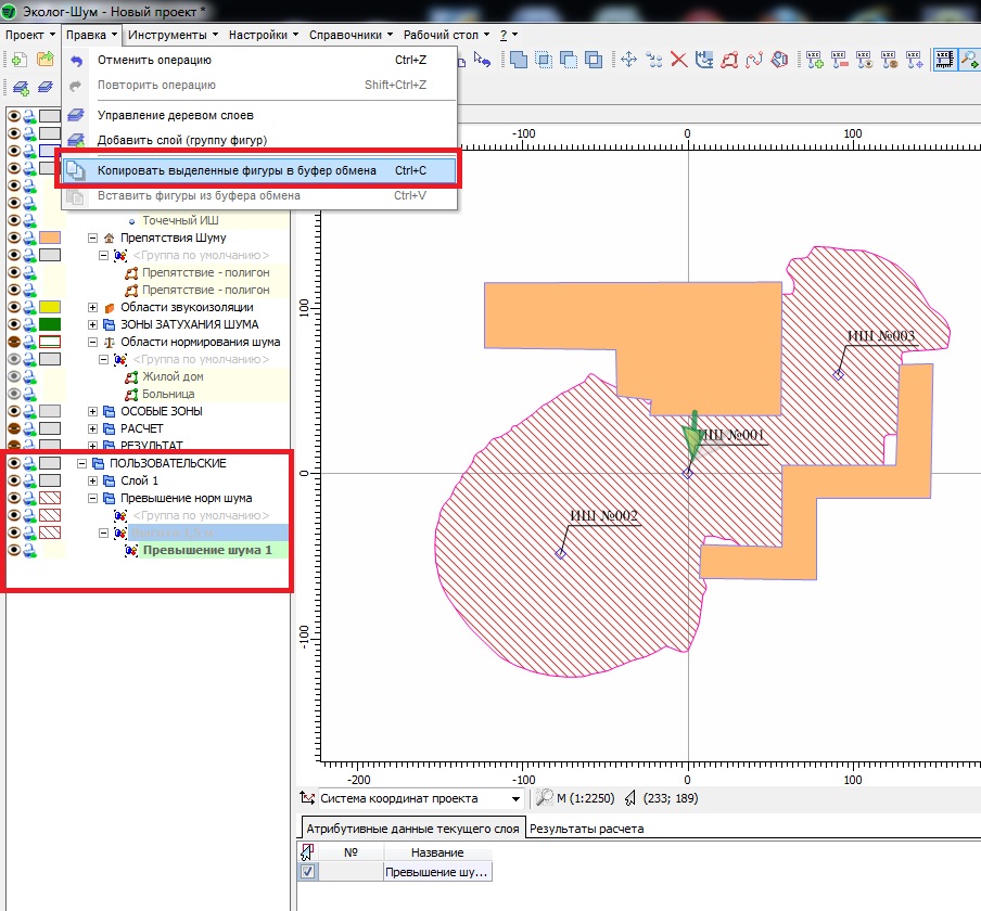 2. Создаются области нормирования с разными нормативами. 3. Из справочника или вручную задаются нормативы для территории. 4. На панели инструментов выбирается инструмент "Нормирование шума", в окне инструмента задаются нормы для остальной территории, не попавшей в особые зоны (жилой дом, больница и т.д.). 5. После нажатия кнопки "ОК" происходит расчет области, в которой ни по одной из территорий не будет превышения. В пользовательских слоях создается еще один слой "Превышение норм шума". На данном скриншоте специально скрыт ряд слоев, чтобы не отвлекать внимание, и оставлена только зона с превышением. 6. Если в вашем распоряжении вариант программы "Стандарт", то вы можете скопировать эту зону в слой СЗЗ.
